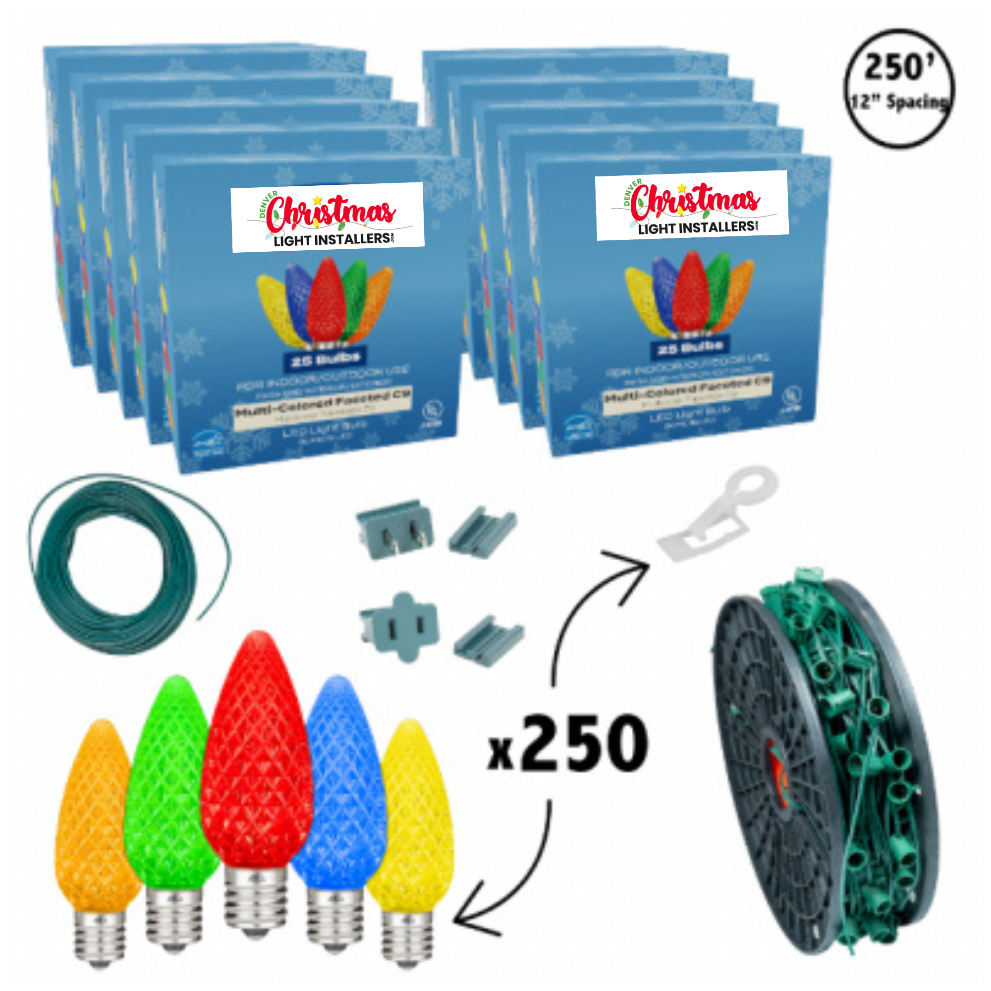 250′ LED Diamond Faceted Multi Color Green Wire w/12″ Bulb Spacing